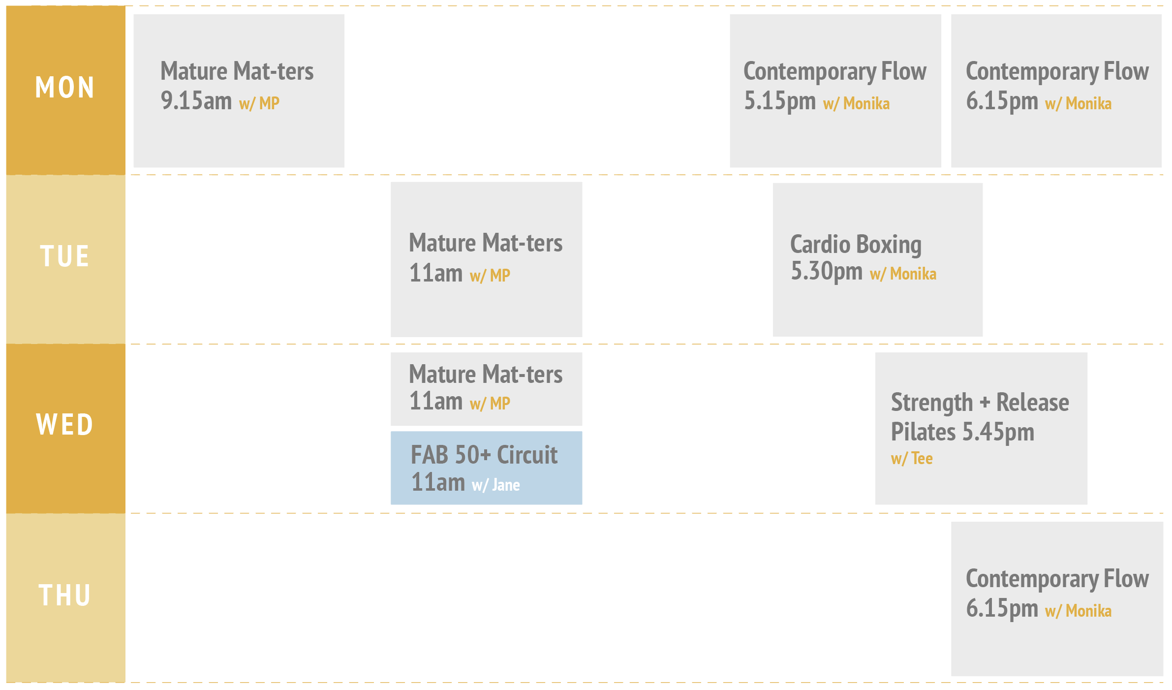 Over 60’s class. Experience renewed muscle strength, flexibility, posture and balance through this group mat session. Designed for mature clients, reap the benefits of increased well-being and enhanced mind-body connection while interacting with peers.
